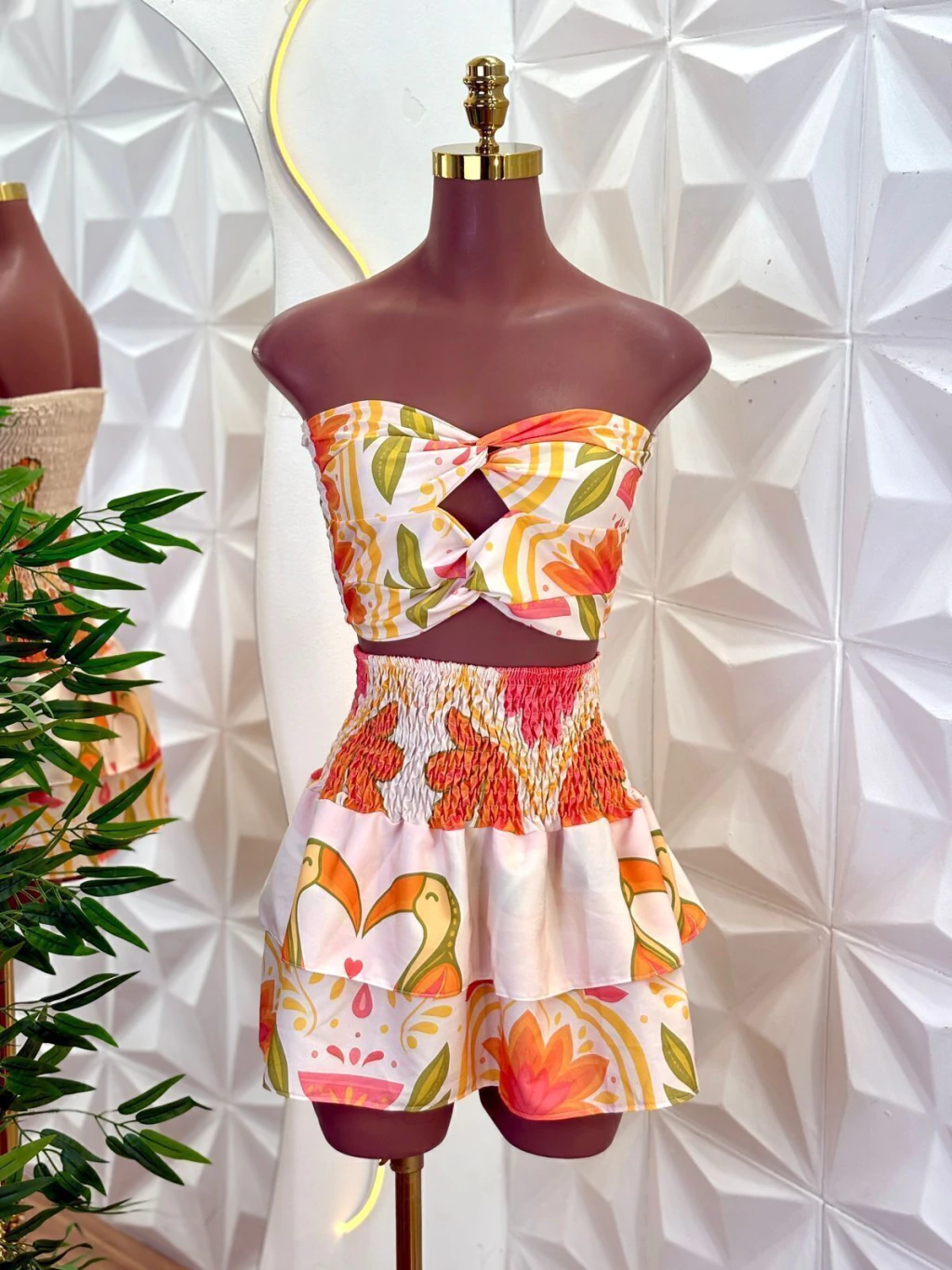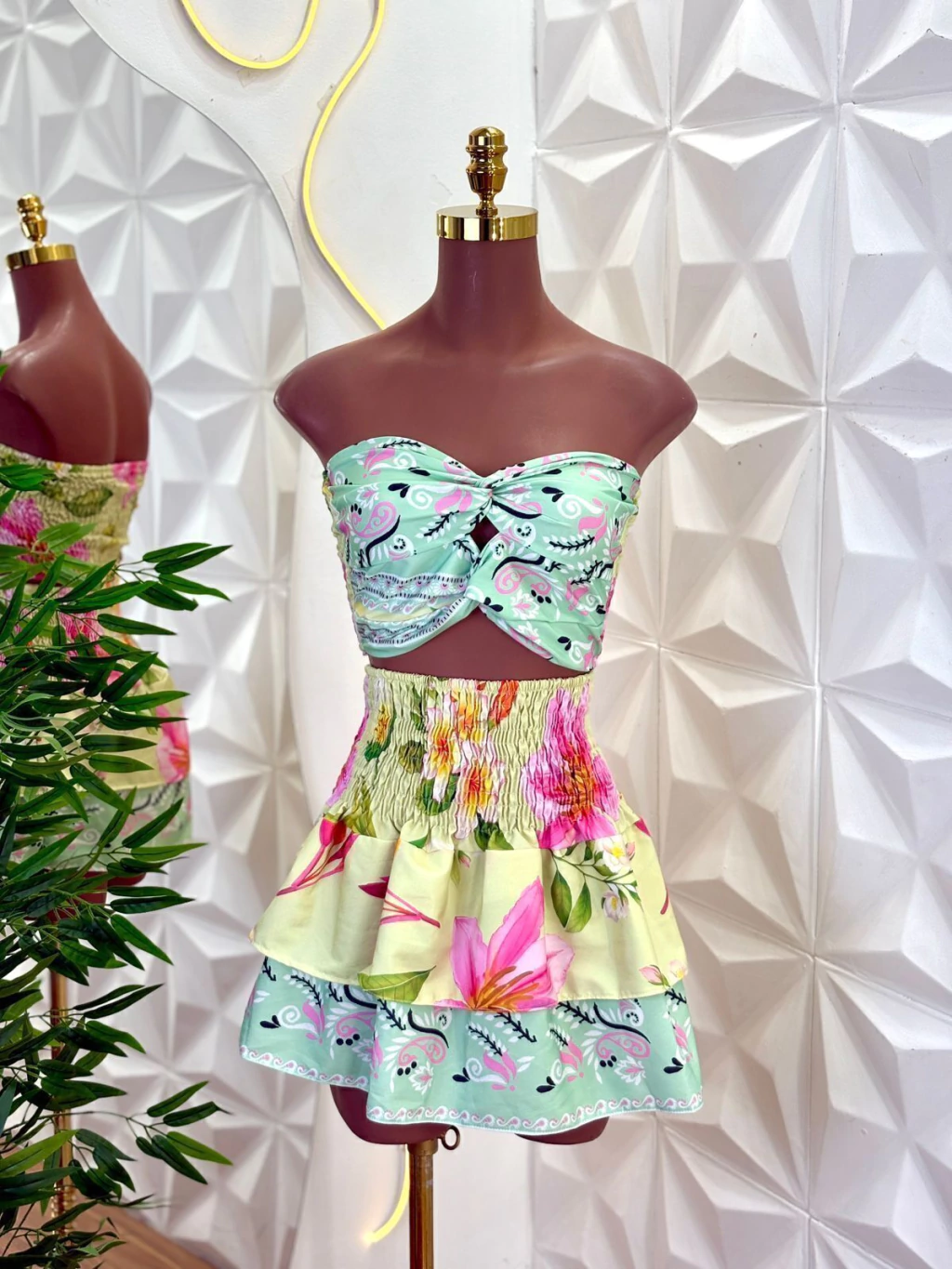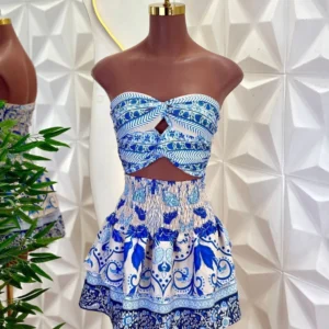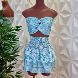 Conjunto leve e super feminino, composto por top estruturado com recorte frontal e um caimento que valoriza o busto. A saia possui cós lastec que se ajusta perfeitamente ao corpo, além de babados que garantem movimento e um caimento delicado.