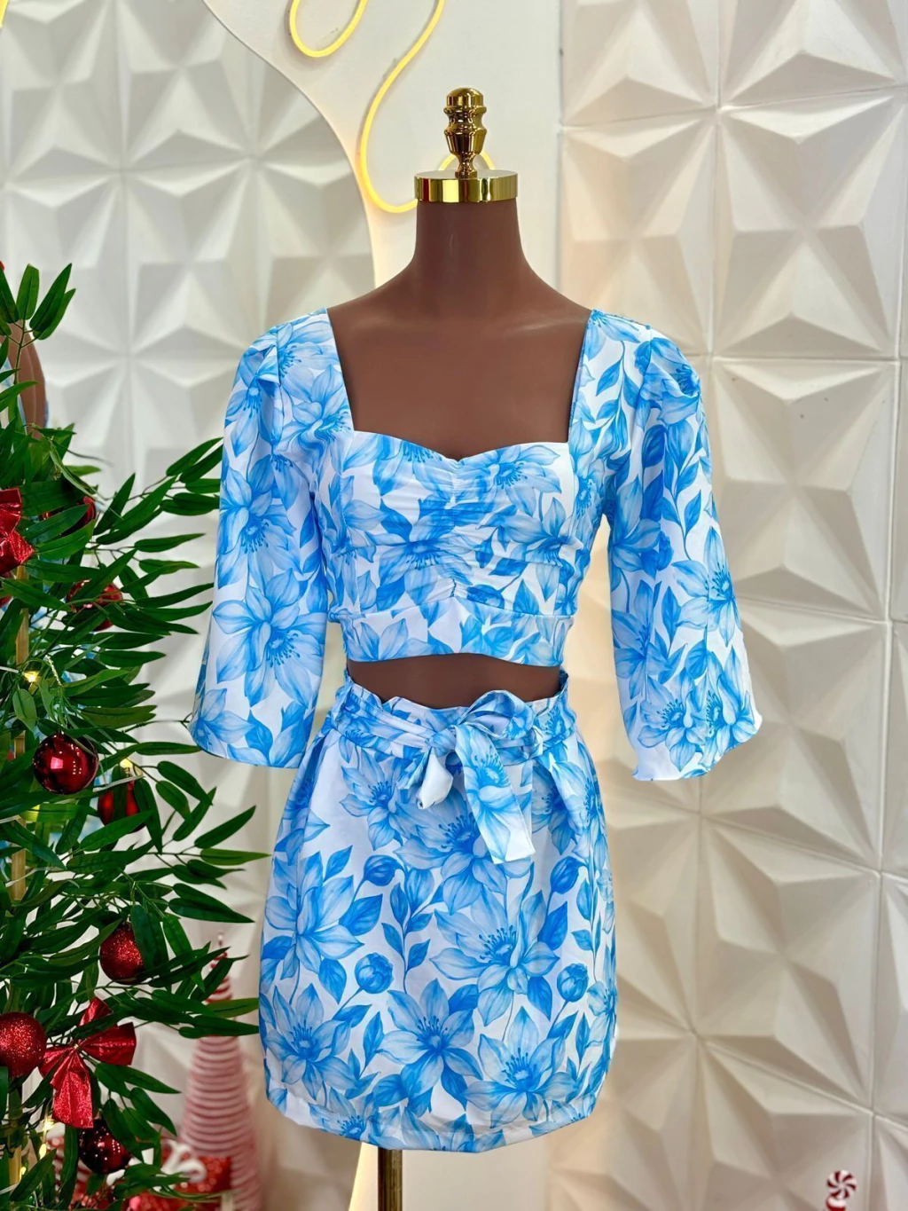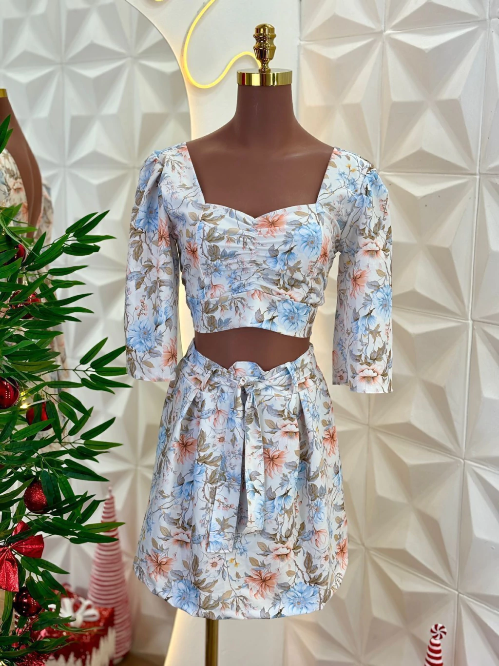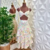 O conjunto Nayana poussui um cropped de mangas bufantes e decote reto que valoriza o colo, combinado a um short-saia com amarração frontal, garantindo conforto e um toque romântico ao visual. Uma opção charmosa e feminina para quem busca elegância com praticidade.