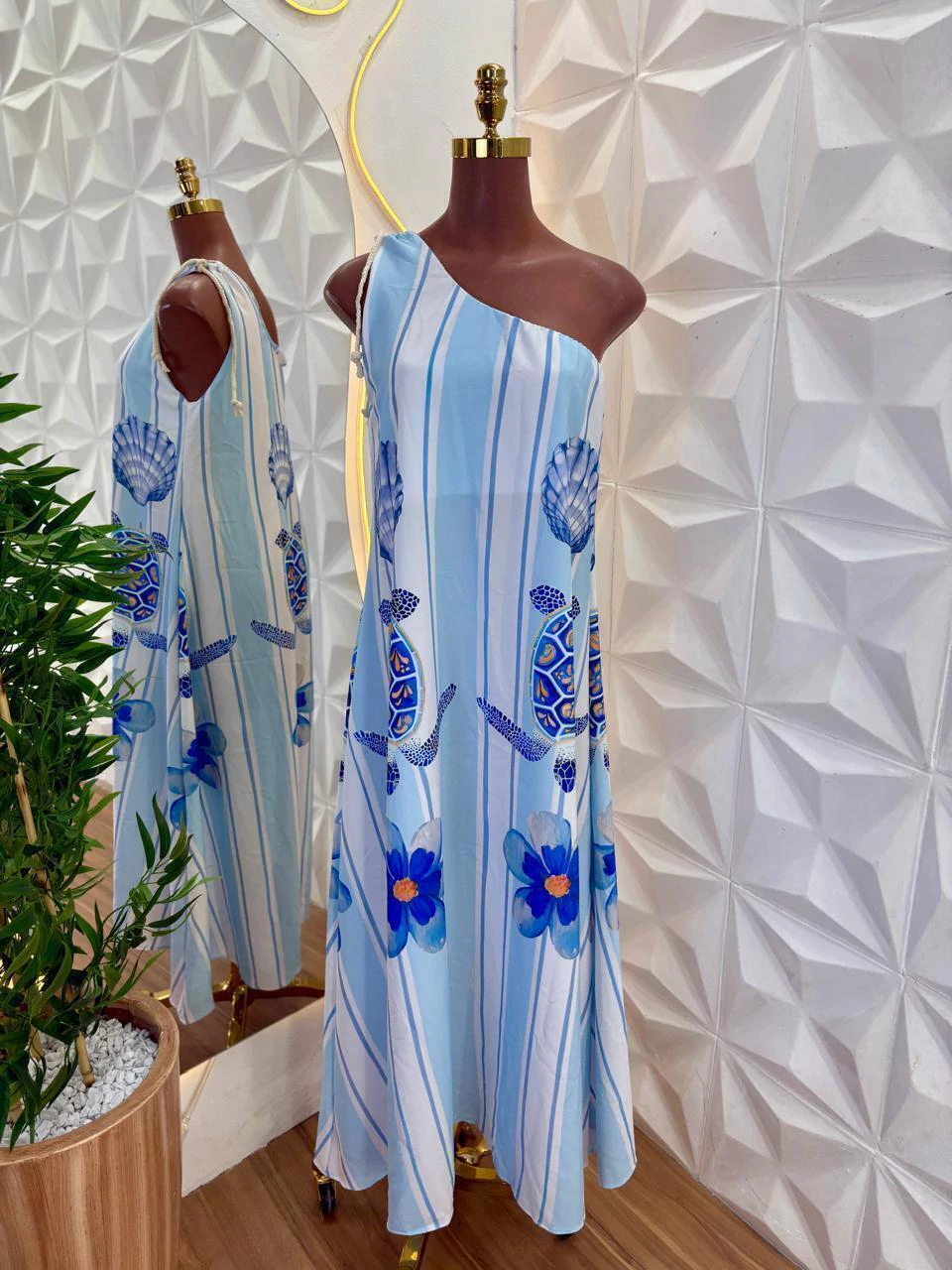 O decote de um ombro só traz um toque moderno e elegante, valorizado por detalhe em amarração que adiciona charme ao design.