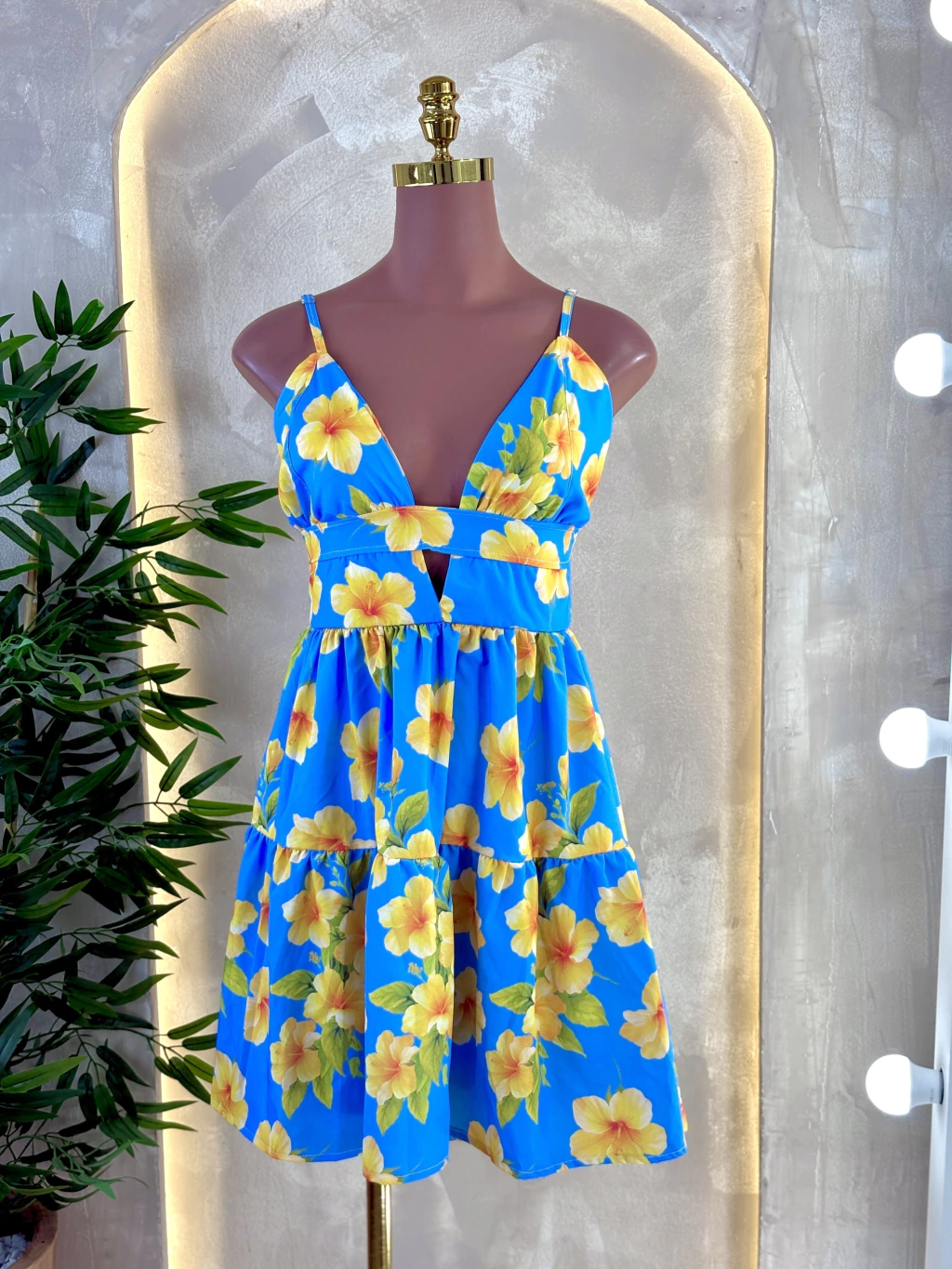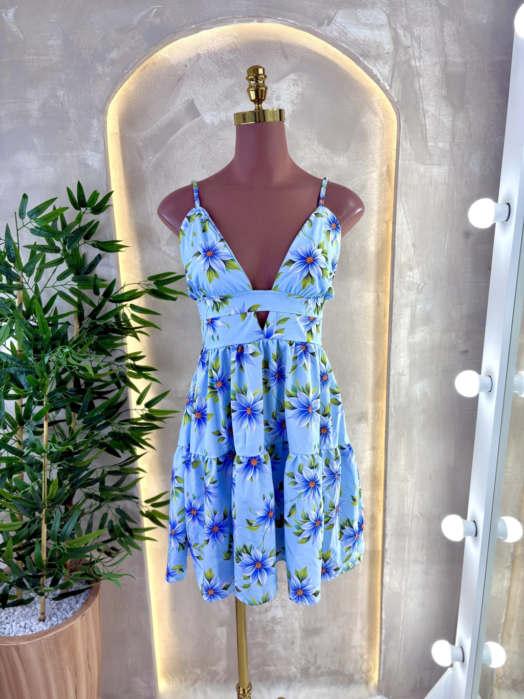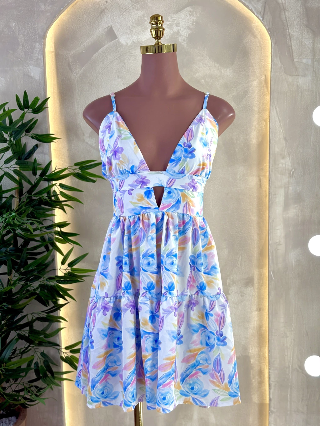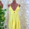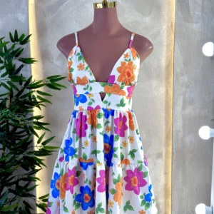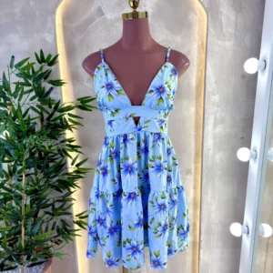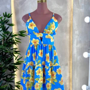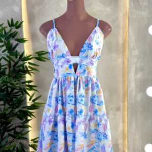 Um vestido leve e delicado, com alcinhas finas e decote em V que valoriza o colo. Possui detalhe vazado abaixo do busto e saia com caimento fluido em camadas, trazendo movimento e um toque romântico para a peça.